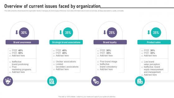 This slide presents critical issues the organization faces in managing its brand equity effectively. It provides information about brand awareness, strategic associations, quality, and sales. Want to ace your presentation in front of a live audience Our Brand Equity Management To Raise Overview Of Current Issues Faced By Organization can help you do that by engaging all the users towards you. Slidegeeks experts have put their efforts and expertise into creating these impeccable powerpoint presentations so that you can communicate your ideas clearly. Moreover, all the templates are customizable, and easy-to-edit and downloadable. Use these for both personal and commercial use. This slide presents critical issues the organization faces in managing its brand equity effectively. It provides information about brand awareness, strategic associations, quality, and sales.