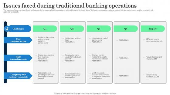 The purpose of the mentioned slide is to showcase the various challenges encountered with traditional banking operations. The issues include poor customer service, high transaction costs, and the complexity with customer complaints. Presenting this PowerPoint presentation, titled Issues Faced During Traditional Banking Operations Incorporating Banking Operational Growth, with topics curated by our researchers after extensive research. This editable presentation is available for immediate download and provides attractive features when used. Download now and captivate your audience. Presenting this Issues Faced During Traditional Banking Operations Incorporating Banking Operational Growth. Our researchers have carefully researched and created these slides with all aspects taken into consideration. This is a completely customizable Issues Faced During Traditional Banking Operations Incorporating Banking Operational Growth that is available for immediate downloading. Download now and make an impact on your audience. Highlight the attractive features available with our PPTs. The purpose of the mentioned slide is to showcase the various challenges encountered with traditional banking operations. The issues include poor customer service, high transaction costs, and the complexity with customer complaints.