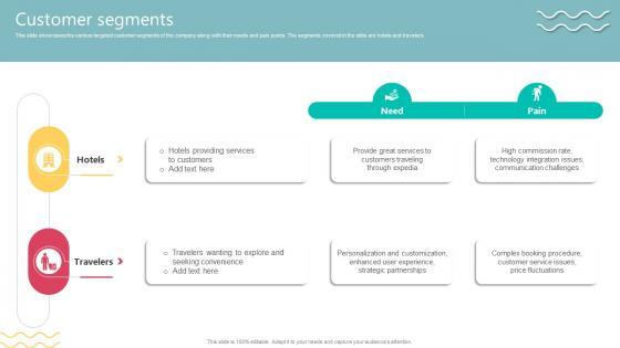 This slide showcases the various targeted customer segments of the company along with their needs and pain points. The segments covered in the slide are hotels and travelers. There are so many reasons you need a Customer Segments Travel Technology Company Business Model BMC SS V. The first reason is you can not spend time making everything from scratch, Thus, Slidegeeks has made presentation templates for you too. You can easily download these templates from our website easily. This slide showcases the various targeted customer segments of the company along with their needs and pain points. The segments covered in the slide are hotels and travelers.