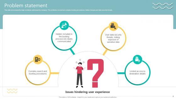 This slide showcases the major problems addressed by company. The problems covered are complex booking procedures, hidden charges and data security threats. Whether you have daily or monthly meetings, a brilliant presentation is necessary. Problem Statement Travel Technology Company Business Model BMC SS V can be your best option for delivering a presentation. Represent everything in detail using Problem Statement Travel Technology Company Business Model BMC SS V and make yourself stand out in meetings. The template is versatile and follows a structure that will cater to your requirements. All the templates prepared by Slidegeeks are easy to download and edit. Our research experts have taken care of the corporate themes as well. So, give it a try and see the results. This slide showcases the major problems addressed by company. The problems covered are complex booking procedures, hidden charges and data security threats.