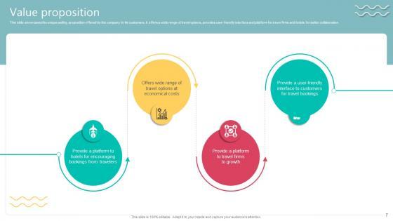 This slide showcases the unique selling proposition offered by the company to its customers. It offers a wide range of travel options, provides user friendly interface and platform for travel firms and hotels for better collaboration. If you are looking for a format to display your unique thoughts, then the professionally designed Value proposition Travel Technology Company Business Model BMC SS V is the one for you. You can use it as a Google Slides template or a PowerPoint template. Incorporate impressive visuals, symbols, images, and other charts. Modify or reorganize the text boxes as you desire. Experiment with shade schemes and font pairings. Alter, share or cooperate with other people on your work. Download Value proposition Travel Technology Company Business Model BMC SS V and find out how to give a successful presentation. Present a perfect display to your team and make your presentation unforgettable. This slide showcases the unique selling proposition offered by the company to its customers. It offers a wide range of travel options, provides user friendly interface and platform for travel firms and hotels for better collaboration.