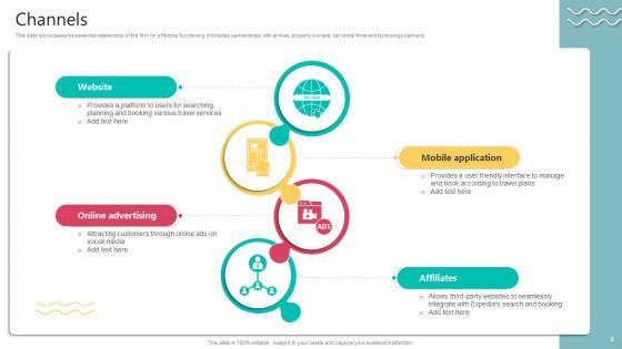 This slide showcases the essential relationship of the firm for effective functioning. It includes partnerships with airlines, property owners, car rental firms and technology partners. Boost your pitch with our creative Channels Travel Technology Company Business Model BMC SS V. Deliver an awe-inspiring pitch that will mesmerize everyone. Using these presentation templates you will surely catch everyones attention. You can browse the ppts collection on our website. We have researchers who are experts at creating the right content for the templates. So you do not have to invest time in any additional work. Just grab the template now and use them. This slide showcases the essential relationship of the firm for effective functioning. It includes partnerships with airlines, property owners, car rental firms and technology partners.