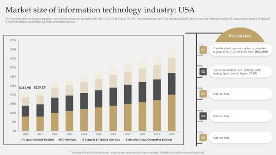 The following slide showcases expected revenue and compound annual growth rate CAGR of IT industry in USA. Information covered in this statistical slide is related to project-oriented services, IT outsourcing services, IT support and training services, and enterprise cloud computing services. If your project calls for a presentation, then Slidegeeks is your go-to partner because we have professionally designed, easy-to-edit templates that are perfect for any presentation. After downloading, you can easily edit IT Industry Market Research Market Size Of Information Technology Industry USA Formats Pdf and make the changes accordingly. You can rearrange slides or fill them with different images. Check out all the handy templates The following slide showcases expected revenue and compound annual growth rate CAGR of IT industry in USA. Information covered in this statistical slide is related to project-oriented services, IT outsourcing services, IT support and training services, and enterprise cloud computing services.