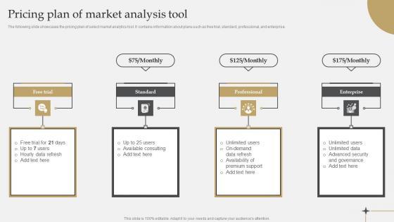 The following slide showcases the pricing plan of select market analytics tool. It contains information about plans such as free trial, standard, professional, and enterprise. Formulating a presentation can take up a lot of effort and time, so the content and message should always be the primary focus. The visuals of the PowerPoint can enhance the presenters message, so our IT Industry Market Research Pricing Plan Of Market Analysis Tool Rules Pdf was created to help save time. Instead of worrying about the design, the presenter can concentrate on the message while our designers work on creating the ideal templates for whatever situation is needed. Slidegeeks has experts for everything from amazing designs to valuable content, we have put everything into IT Industry Market Research Pricing Plan Of Market Analysis Tool Rules Pdf. The following slide showcases the pricing plan of select market analytics tool. It contains information about plans such as free trial, standard, professional, and enterprise.