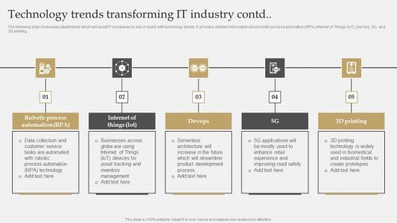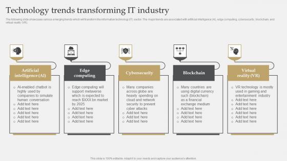 The following slide showcases various emerging trends which will transform the information technology IT sector. The major trends are associated with artificial intelligence AI, edge computing, cybersecurity, blockchain, and virtual reality VR. Welcome to our selection of the IT Industry Market Research Technology Trends Transforming It Industry Infographics Pdf. These are designed to help you showcase your creativity and bring your sphere to life. Planning and Innovation are essential for any business that is just starting out. This collection contains the designs that you need for your everyday presentations. All of our PowerPoints are 100 percent editable, so you can customize them to suit your needs. This multi-purpose template can be used in various situations. Grab these presentation templates today. The following slide showcases various emerging trends which will transform the information technology IT sector. The major trends are associated with artificial intelligence AI, edge computing, cybersecurity, blockchain, and virtual reality VR.