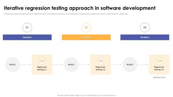 This slide showcases the iteration process for regression testing. The purpose of this slide is to briefly describe the three iteration processes such as build 1, build 2 and build 3, respectively. Slidegeeks has constructed Iterative Regression Testing Approach In Software Corrective Regression Testing Ppt Sample after conducting extensive research and examination. These presentation templates are constantly being generated and modified based on user preferences and critiques from editors. Here, you will find the most attractive templates for a range of purposes while taking into account ratings and remarks from users regarding the content. This is an excellent jumping-off point to explore our content and will give new users an insight into our top-notch PowerPoint Templates. This slide showcases the iteration process for regression testing. The purpose of this slide is to briefly describe the three iteration processes such as build 1, build 2 and build 3, respectively.