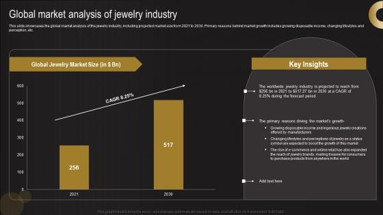 This slide showcases the global market analysis of the jewelry industry, including projected market size from 2021 to 2030. Primary reasons behind market growth includes growing disposable income, changing lifestyles and perception, etc. Are you searching for a Global Market Analysis Of Jewelry Industry Jewelry Business Plan Elements Pdf that is uncluttered, straightforward, and original It is easy to edit, and you can change the colors to suit your personal or business branding. For a presentation that expresses how much effort you have put in, this template is ideal With all of its features, including tables, diagrams, statistics, and lists, it is perfect for a business plan presentation. Make your ideas more appealing with these professional slides. Download Global Market Analysis Of Jewelry Industry Jewelry Business Plan Elements Pdf from Slidegeeks today. This slide showcases the global market analysis of the jewelry industry, including projected market size from 2021 to 2030. Primary reasons behind market growth includes growing disposable income, changing lifestyles and perception, etc.