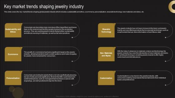 This slide covers the key market trends shaping global jewelry industry which includes sustainability and ethics, ecommerce, personalization, wearable technology, new materials and styles, etc. Formulating a presentation can take up a lot of effort and time, so the content and message should always be the primary focus. The visuals of the PowerPoint can enhance the presenters message, so our Key Market Trends Shaping Jewelry Industry Jewelry Products Business Designs Pdf was created to help save time. Instead of worrying about the design, the presenter can concentrate on the message while our designers work on creating the ideal templates for whatever situation is needed. Slidegeeks has experts for everything from amazing designs to valuable content, we have put everything into Key Market Trends Shaping Jewelry Industry Jewelry Products Business Designs Pdf This slide covers the key market trends shaping global jewelry industry which includes sustainability and ethics, ecommerce, personalization, wearable technology, new materials and styles, etc.