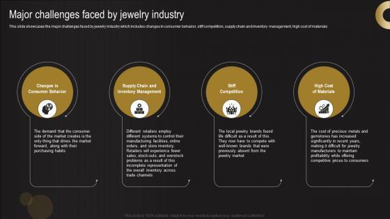 This slide showcases the major challenges faced by jewelry industry which includes changes in consumer behavior, stiff competition, supply chain and inventory management, high cost of materials Do you know about Slidesgeeks Major Challenges Faced By Jewelry Industry Jewelry Business Plan Brochure Pdf These are perfect for delivering any kind od presentation. Using it, create PowerPoint presentations that communicate your ideas and engage audiences. Save time and effort by using our pre-designed presentation templates that are perfect for a wide range of topic. Our vast selection of designs covers a range of styles, from creative to business, and are all highly customizable and easy to edit. Download as a PowerPoint template or use them as Google Slides themes. This slide showcases the major challenges faced by jewelry industry which includes changes in consumer behavior, stiff competition, supply chain and inventory management, high cost of materials