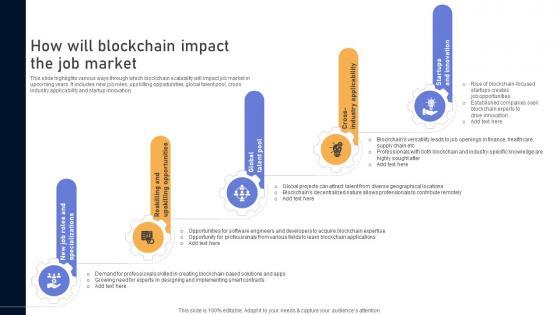 This slide highlights various ways through which blockchain scalability will impact job market in upcoming years. It includes new job roles, upskilling opportunities, global talent pool, cross industry applicability and startup innovation. Welcome to our selection of the Comprehensive Look At Blockchain How Will Blockchain Impact The Job Market BCT SS V. These are designed to help you showcase your creativity and bring your sphere to life. Planning and Innovation are essential for any business that is just starting out. This collection contains the designs that you need for your everyday presentations. All of our PowerPoints are 100Percent editable, so you can customize them to suit your needs. This multi-purpose template can be used in various situations. Grab these presentation templates today. This slide highlights various ways through which blockchain scalability will impact job market in upcoming years. It includes new job roles, upskilling opportunities, global talent pool, cross industry applicability and startup innovation.