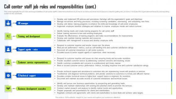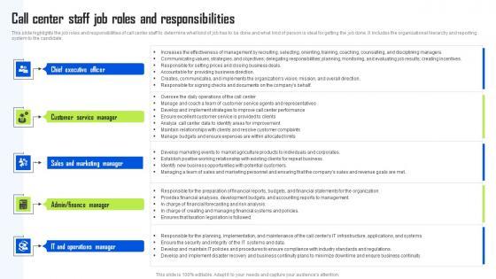 This slide highlights the job roles and responsibilities of call center staff to determine what kind of job has to be done and what kind of person is ideal for getting the job done. It includes the organizational hierarchy and reporting system to the candidate. Whether you have daily or monthly meetings, a brilliant presentation is necessary. Call Center Staff Job Roles And Responsibilities BPO Center Business Plan Infographics Pdf can be your best option for delivering a presentation. Represent everything in detail using Call Center Staff Job Roles And Responsibilities BPO Center Business Plan Infographics Pdf and make yourself stand out in meetings. The template is versatile and follows a structure that will cater to your requirements. All the templates prepared by Slidegeeks are easy to download and edit. Our research experts have taken care of the corporate themes as well. So, give it a try and see the results. This slide highlights the job roles and responsibilities of call center staff to determine what kind of job has to be done and what kind of person is ideal for getting the job done. It includes the organizational hierarchy and reporting system to the candidate.
