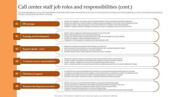 This slide highlights the job roles and responsibilities of call center staff to determine what kind of job has to be done and what kind of person is ideal for getting the job done. It includes the organizational hierarchy and reporting system to the candidate. Coming up with a presentation necessitates that the majority of the effort goes into the content and the message you intend to convey. The visuals of a PowerPoint presentation can only be effective if it supplements and supports the story that is being told. Keeping this in mind our experts created Call Center Staff Job Roles And Responsibilities IT And Tech Support Business Background Pdf to reduce the time that goes into designing the presentation. This way, you can concentrate on the message while our designers take care of providing you with the right template for the situation. This slide highlights the job roles and responsibilities of call center staff to determine what kind of job has to be done and what kind of person is ideal for getting the job done. It includes the organizational hierarchy and reporting system to the candidate.