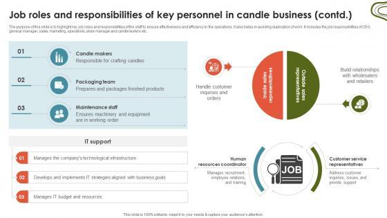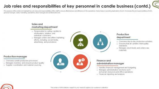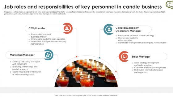 The purpose of this slide is to highlight key job roles and responsibilities of the staff to ensure effectiveness and efficiency in the operations. It also helps in avoiding duplication of work. It includes the job responsibilities of CEO, general manager, sales, marketing, operations, store manager and candle testers etc. This Candle Business Venture Job Roles And Responsibilities Of Key Personnel In Candle BP SS V is perfect for any presentation, be it in front of clients or colleagues. It is a versatile and stylish solution for organizing your meetings. The Candle Business Venture Job Roles And Responsibilities Of Key Personnel In Candle BP SS V features a modern design for your presentation meetings. The adjustable and customizable slides provide unlimited possibilities for acing up your presentation. Slidegeeks has done all the homework before launching the product for you. So, do not wait, grab the presentation templates today The purpose of this slide is to highlight key job roles and responsibilities of the staff to ensure effectiveness and efficiency in the operations. It also helps in avoiding duplication of work. It includes the job responsibilities of CEO, general manager, sales, marketing, operations, store manager and candle testers etc.