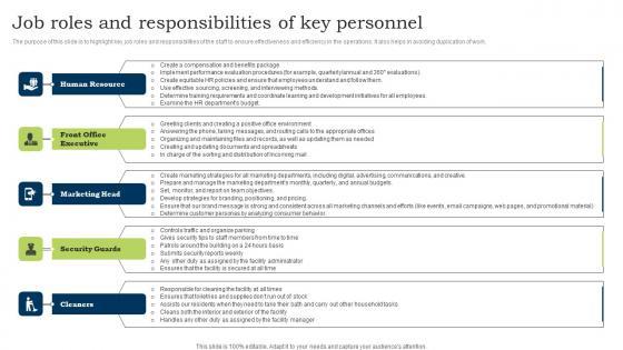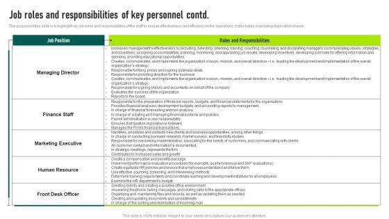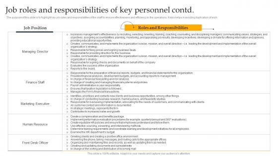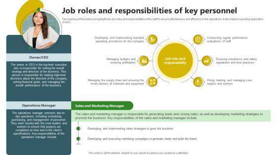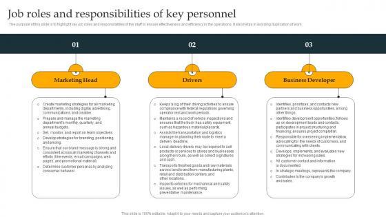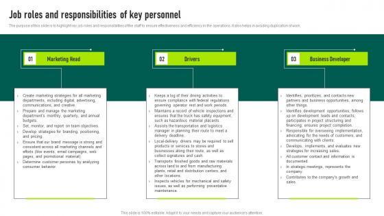 The purpose of this slide is to highlight key job roles and responsibilities of the staff to ensure effectiveness and efficiency in the operations. It also helps in avoiding duplication of work. Make sure to capture your audiences attention in your business displays with our gratis customizable Job Roles And Responsibilities Of Key Personnel Trucking Services Business Plan Guidelines Pdf These are great for business strategies, office conferences, capital raising or task suggestions. If you desire to acquire more customers for your tech business and ensure they stay satisfied, create your own sales presentation with these plain slides. The purpose of this slide is to highlight key job roles and responsibilities of the staff to ensure effectiveness and efficiency in the operations. It also helps in avoiding duplication of work.
