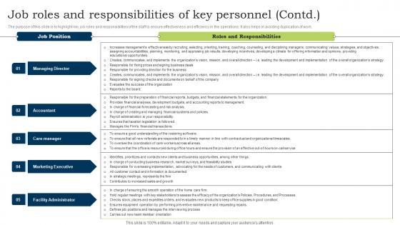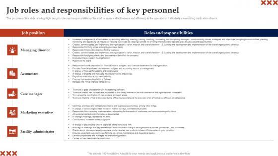 The purpose of this slide is to highlight key job roles and responsibilities of the staff to ensure effectiveness and efficiency in the operations. It also helps in avoiding duplication of work. This modern and well-arranged Job Roles And Responsibilities Of Key Personnel In Home Care Business Plan Formats Pdf provides lots of creative possibilities. It is very simple to customize and edit with the Powerpoint Software. Just drag and drop your pictures into the shapes. All facets of this template can be edited with Powerpoint, no extra software is necessary. Add your own material, put your images in the places assigned for them, adjust the colors, and then you can show your slides to the world, with an animated slide included. The purpose of this slide is to highlight key job roles and responsibilities of the staff to ensure effectiveness and efficiency in the operations. It also helps in avoiding duplication of work.