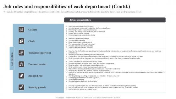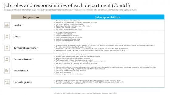The purpose of this slide is to highlight key job roles and responsibilities of the bank staff to ensure effectiveness and efficiency in the operations. It also helps in avoiding duplication of work. Coming up with a presentation necessitates that the majority of the effort goes into the content and the message you intend to convey. The visuals of a PowerPoint presentation can only be effective if it supplements and supports the story that is being told. Keeping this in mind our experts created Job Roles And Responsibilities Banking Industry Business Plan Go To Market Strategy Demonstration Pdf to reduce the time that goes into designing the presentation. This way, you can concentrate on the message while our designers take care of providing you with the right template for the situation. The purpose of this slide is to highlight key job roles and responsibilities of the bank staff to ensure effectiveness and efficiency in the operations. It also helps in avoiding duplication of work.