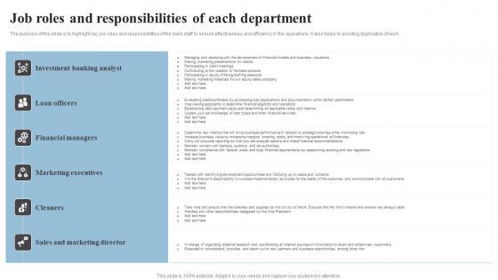 The purpose of this slide is to highlight key job roles and responsibilities of the bank staff to ensure effectiveness and efficiency in the operations. It also helps in avoiding duplication of work. Formulating a presentation can take up a lot of effort and time, so the content and message should always be the primary focus. The visuals of the PowerPoint can enhance the presenters message, so our Job Roles And Responsibilities Of Each Banking Start Up B Plan Go To Market Strategy Demonstration Pdf was created to help save time. Instead of worrying about the design, the presenter can concentrate on the message while our designers work on creating the ideal templates for whatever situation is needed. Slidegeeks has experts for everything from amazing designs to valuable content, we have put everything into Job Roles And Responsibilities Of Each Banking Start Up B Plan Go To Market Strategy Demonstration Pdf The purpose of this slide is to highlight key job roles and responsibilities of the bank staff to ensure effectiveness and efficiency in the operations. It also helps in avoiding duplication of work.