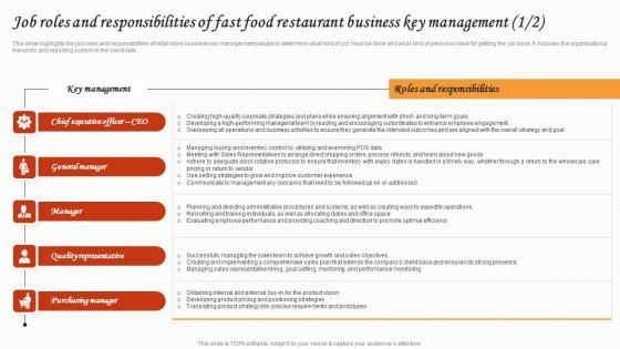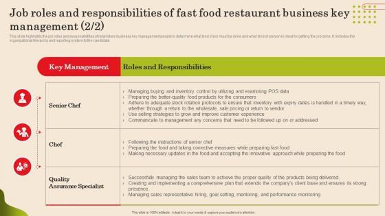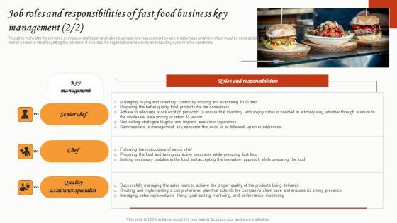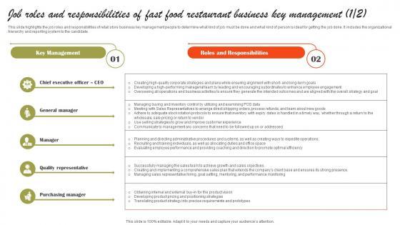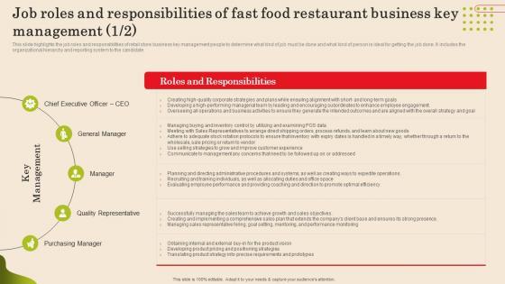 This slide highlights the job roles and responsibilities of retail store business key management people to determine what kind of job must be done and what kind of person is ideal for getting the job done. It includes the organizational hierarchy and reporting system to the candidate. Do you know about Slidesgeeks Job Roles And Responsibilities Of Fast Food Restaurant Small Restaurant Business Mockup Pdf These are perfect for delivering any kind od presentation. Using it, create PowerPoint presentations that communicate your ideas and engage audiences. Save time and effort by using our pre-designed presentation templates that are perfect for a wide range of topic. Our vast selection of designs covers a range of styles, from creative to business, and are all highly customizable and easy to edit. Download as a PowerPoint template or use them as Google Slides themes. This slide highlights the job roles and responsibilities of retail store business key management people to determine what kind of job must be done and what kind of person is ideal for getting the job done. It includes the organizational hierarchy and reporting system to the candidate.