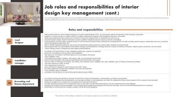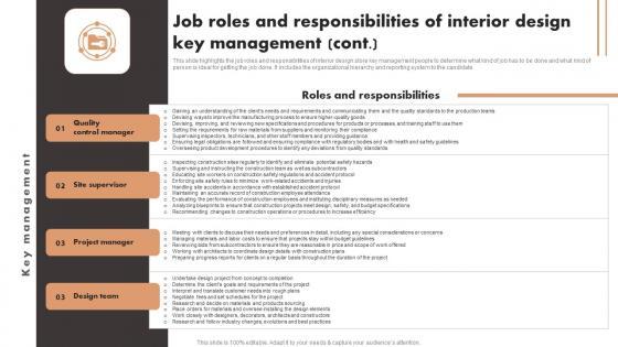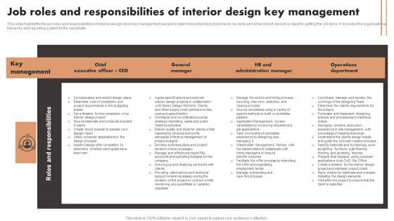 This slide highlights the job roles and responsibilities of interior design store key management people to determine what kind of job has to be done and what kind of person is ideal for getting the job done. It includes the organizational hierarchy and reporting system to the candidate. Take your projects to the next level with our ultimate collection of Job Roles And Responsibilities Of Interior Design Key Management Luxury Interior Design Themes Pdf Slidegeeks has designed a range of layouts that are perfect for representing task or activity duration, keeping track of all your deadlines at a glance. Tailor these designs to your exact needs and give them a truly corporate look with your own brand colors they well make your projects stand out from the rest. This slide highlights the job roles and responsibilities of interior design store key management people to determine what kind of job has to be done and what kind of person is ideal for getting the job done. It includes the organizational hierarchy and reporting system to the candidate.