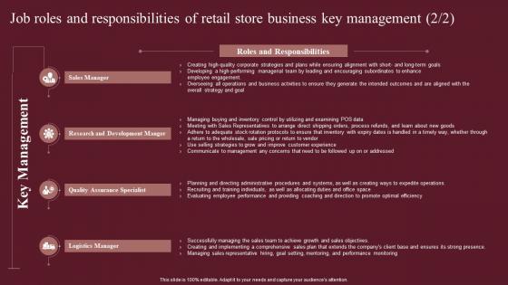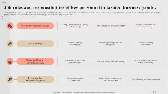 The purpose of this slide is to highlight key job roles and responsibilities of the staff to ensure effectiveness and efficiency in the operations. It also helps in avoiding duplication of work. It includes the job responsibilities of CEO, general manager, sales, marketing, operations, store manager and sales-marketing managers etc. The best PPT templates are a great way to save time, energy, and resources. Slidegeeks have 100 percent editable powerpoint slides making them incredibly versatile. With these quality presentation templates, you can create a captivating and memorable presentation by combining visually appealing slides and effectively communicating your message. Download Job Roles And Responsibilities Of Key Personnel Fashion Startup Roadmap Plan Ppt Presentation BP SS V from Slidegeeks and deliver a wonderful presentation. The purpose of this slide is to highlight key job roles and responsibilities of the staff to ensure effectiveness and efficiency in the operations. It also helps in avoiding duplication of work. It includes the job responsibilities of CEO, general manager, sales, marketing, operations, store manager and sales-marketing managers etc.