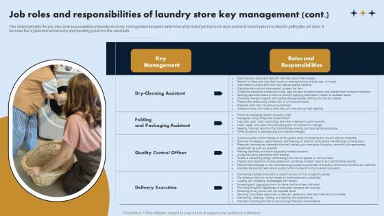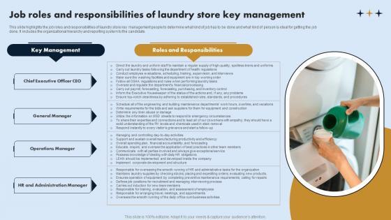 This slide highlights the job roles and responsibilities of laundry store key management people to determine what kind of job has to be done and what kind of person is ideal for getting the job done. It includes the organizational hierarchy and reporting system to the candidate.Make sure to capture your audiences attention in your business displays with our gratis customizable Job Roles And Responsibilities Of Laundry Laundromat Business Plan Go To Market Designs Pdf These are great for business strategies, office conferences, capital raising or task suggestions. If you desire to acquire more customers for your tech business and ensure they stay satisfied, create your own sales presentation with these plain slides. This slide highlights the job roles and responsibilities of laundry store key management people to determine what kind of job has to be done and what kind of person is ideal for getting the job done. It includes the organizational hierarchy and reporting system to the candidate.