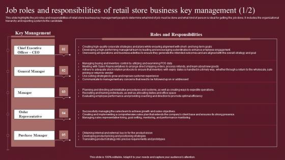 This slide highlights the job roles and responsibilities of retail store business key management people to determine what kind of job must be done and what kind of person is ideal for getting the job done. It includes the organizational hierarchy and reporting system to the candidate. This Job Roles And Responsibilities Of Retail Store Business Fashion Business Plan Guidelines Pdf is perfect for any presentation, be it in front of clients or colleagues. It is a versatile and stylish solution for organizing your meetings. The Job Roles And Responsibilities Of Retail Store Business Fashion Business Plan Guidelines Pdf features a modern design for your presentation meetings. The adjustable and customizable slides provide unlimited possibilities for acing up your presentation. Slidegeeks has done all the homework before launching the product for you. So, do not wait, grab the presentation templates today This slide highlights the job roles and responsibilities of retail store business key management people to determine what kind of job must be done and what kind of person is ideal for getting the job done. It includes the organizational hierarchy and reporting system to the candidate.