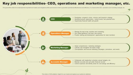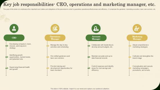 The goal of this slide is to emphasize the important work duties and obligations of the personnel in order to guarantee operational effectiveness and efficiency. It comprises the CEO, operations and marketing manager, etc. Formulating a presentation can take up a lot of effort and time, so the content and message should always be the primary focus. The visuals of the PowerPoint can enhance the presenters message, so our Lawn Care Services Business Plan Key Job Responsibilities Ceo Operations And Marketing BP SS V was created to help save time. Instead of worrying about the design, the presenter can concentrate on the message while our designers work on creating the ideal templates for whatever situation is needed. Slidegeeks has experts for everything from amazing designs to valuable content, we have put everything into Lawn Care Services Business Plan Key Job Responsibilities Ceo Operations And Marketing BP SS V, The goal of this slide is to emphasize the important work duties and obligations of the personnel in order to guarantee operational effectiveness and efficiency. It comprises the CEO, operations and marketing manager, etc.