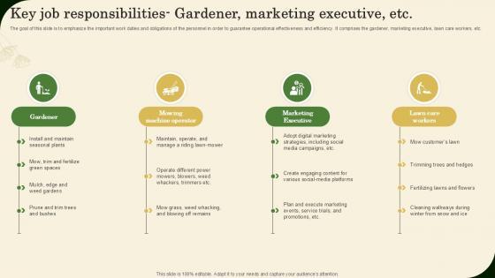 The goal of this slide is to emphasize the important work duties and obligations of the personnel in order to guarantee operational effectiveness and efficiency. It comprises the gardener, marketing executive, lawn care workers, etc. Coming up with a presentation necessitates that the majority of the effort goes into the content and the message you intend to convey. The visuals of a PowerPoint presentation can only be effective if it supplements and supports the story that is being told. Keeping this in mind our experts created Key Job Responsibilities Gardener Marketing Executive Etc Landscaping Business Plan Ppt Sample BP SS V to reduce the time that goes into designing the presentation. This way, you can concentrate on the message while our designers take care of providing you with the right template for the situation. The goal of this slide is to emphasize the important work duties and obligations of the personnel in order to guarantee operational effectiveness and efficiency. It comprises the gardener, marketing executive, lawn care workers, etc.