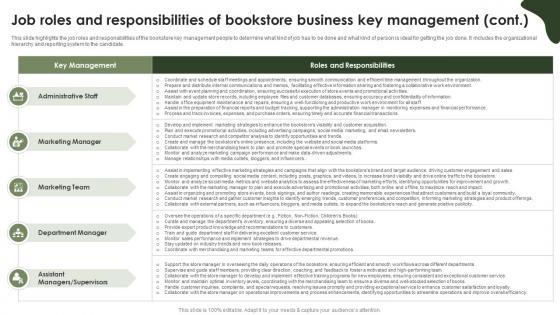 This slide highlights the job roles and responsibilities of the bookstore key management people to determine what kind of job has to be done and what kind of person is ideal for getting the job done. It includes the organizational hierarchy and reporting system to the candidate. Make sure to capture your audiences attention in your business displays with our gratis customizable Online Bookstore Business Plan Job Roles And Responsibilities Of Bookstore Business Key BP SS V. These are great for business strategies, office conferences, capital raising or task suggestions. If you desire to acquire more customers for your tech business and ensure they stay satisfied, create your own sales presentation with these plain slides. This slide highlights the job roles and responsibilities of the bookstore key management people to determine what kind of job has to be done and what kind of person is ideal for getting the job done. It includes the organizational hierarchy and reporting system to the candidate.
