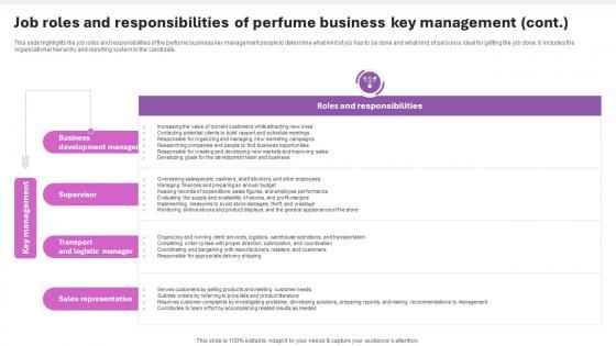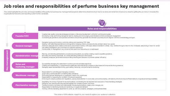 This slide highlights the job roles and responsibilities of the perfume business key management people to determine what kind of job has to be done and what kind of person is ideal for getting the job done. It includes the organizational hierarchy and reporting system to the candidate. If you are looking for a format to display your unique thoughts, then the professionally designed Perfume Manufacturing Business Plan Job Roles And Responsibilities Of Perfume Business BP SS V is the one for you. You can use it as a Google Slides template or a PowerPoint template. Incorporate impressive visuals, symbols, images, and other charts. Modify or reorganize the text boxes as you desire. Experiment with shade schemes and font pairings. Alter, share or cooperate with other people on your work. Download Perfume Manufacturing Business Plan Job Roles And Responsibilities Of Perfume Business BP SS V and find out how to give a successful presentation. Present a perfect display to your team and make your presentation unforgettable. This slide highlights the job roles and responsibilities of the perfume business key management people to determine what kind of job has to be done and what kind of person is ideal for getting the job done. It includes the organizational hierarchy and reporting system to the candidate.
