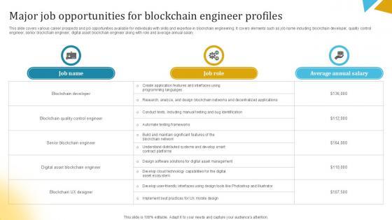 This slide covers various career prospects and job opportunities available for individuals with skills and expertise in blockchain engineering. It covers elements such as job name including blockchain developer, quality control engineer, senior blockchain engineer, digital asset blockchain engineer along with role and average annual salary. Do you have to make sure that everyone on your team knows about any specific topic I yes, then you should give Major Job Opportunities For Blockchain Engineer Profiles PPT Slide BCT SS V a try. Our experts have put a lot of knowledge and effort into creating this impeccable Major Job Opportunities For Blockchain Engineer Profiles PPT Slide BCT SS V. You can use this template for your upcoming presentations, as the slides are perfect to represent even the tiniest detail. You can download these templates from the Slidegeeks website and these are easy to edit. So grab these today This slide covers various career prospects and job opportunities available for individuals with skills and expertise in blockchain engineering. It covers elements such as job name including blockchain developer, quality control engineer, senior blockchain engineer, digital asset blockchain engineer along with role and average annual salary.