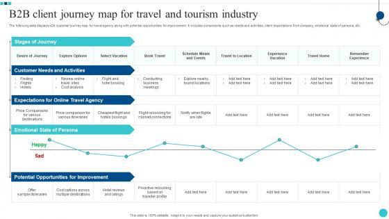 The following slide displays b2b customer journey map for travel agency along with potential opportunities for improvement. It includes components such as needs and activities, client expectations from company, emotional state of persona, etc. Showcasing this set of slides titled B2B Client Journey Map For Travel And Tourism Industry Graphics Pdf. The topics addressed in these templates are Conducting Business Meetings, Experience Vacation, Remember Experience. All the content presented in this PPT design is completely editable. Download it and make adjustments in color, background, font etc. as per your unique business setting. The following slide displays b2b customer journey map for travel agency along with potential opportunities for improvement. It includes components such as needs and activities, client expectations from company, emotional state of persona, etc.