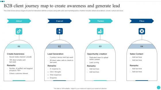 This slide shows various stages of customer interaction with the company along with sales and marketing tactics. It further includes details about attract, convert, nurture and close. Pitch your topic with ease and precision using this B2B Client Journey Map To Create Awareness And Generate Lead Icons Pdf. This layout presents information on Opportunity Creation, Sales Contact, Lead Generation, Create Awareness. It is also available for immediate download and adjustment. So, changes can be made in the color, design, graphics or any other component to create a unique layout. This slide shows various stages of customer interaction with the company along with sales and marketing tactics. It further includes details about attract, convert, nurture and close.