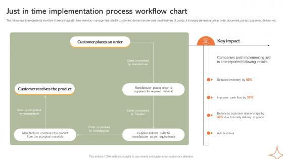 The following slide represents workflow of executing just in time inventory management to fulfill customers demand and ensure timely delivery of goods. It includes elements such as order placement, product assembly, delivery etc. The best PPT templates are a great way to save time, energy, and resources. Slidegeeks have 100 percent editable powerpoint slides making them incredibly versatile. With these quality presentation templates, you can create a captivating and memorable presentation by combining visually appealing slides and effectively communicating your message. Download Just In Time Implementation Process Workflow Chart Implementing Manufacturing Strategy SS V from Slidegeeks and deliver a wonderful presentation. The following slide represents workflow of executing just in time inventory management to fulfill customers demand and ensure timely delivery of goods. It includes elements such as order placement, product assembly, delivery etc.
