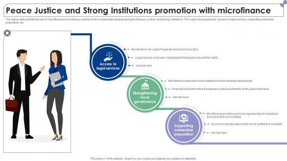 The below slide exhibits the role of microfinance in providing a solution for the sustainable development goal of peace, justice, and strong institutions. The major roles played are access to legal services, supporting vulnerable population, etc. This Peace Justice And Strong Institutions Promotion With Complete Guide To Microfinance Fin SS V is perfect for any presentation, be it in front of clients or colleagues. It is a versatile and stylish solution for organizing your meetings. The Peace Justice And Strong Institutions Promotion With Complete Guide To Microfinance Fin SS V features a modern design for your presentation meetings. The adjustable and customizable slides provide unlimited possibilities for acing up your presentation. Slidegeeks has done all the homework before launching the product for you. So, do not wait, grab the presentation templates today The below slide exhibits the role of microfinance in providing a solution for the sustainable development goal of peace, justice, and strong institutions. The major roles played are access to legal services, supporting vulnerable population, etc.
