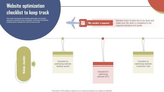 This slide showcases the website optimization checklist to keep track about the work completion. It includes checklist for loading speed, website SEO and conversion rate. Make sure to capture your audiences attention in your business displays with our gratis customizable Website Optimization Checklist To Keep Track Effective Travel Marketing Guide For Improving Designs PDF. These are great for business strategies, office conferences, capital raising or task suggestions. If you desire to acquire more customers for your tech business and ensure they stay satisfied, create your own sales presentation with these plain slides.