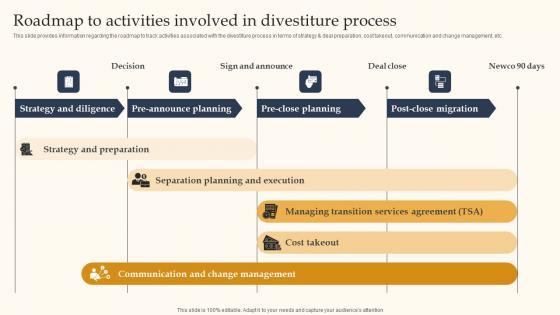 This slide provides information regarding the roadmap to track activities associated with the divestiture process in terms of strategy and deal preparation, cost takeout, communication and change management, etc. Do you have an important presentation coming up Are you looking for something that will make your presentation stand out from the rest Look no further than Roadmap To Activities Involved Key Business Tactics For Organizational Success Topics Pdf. With our professional designs, you can trust that your presentation will pop and make delivering it a smooth process. And with Slidegeeks, you can trust that your presentation will be unique and memorable. So why wait Grab Roadmap To Activities Involved Key Business Tactics For Organizational Success Topics Pdf today and make your presentation stand out from the rest This slide provides information regarding the roadmap to track activities associated with the divestiture process in terms of strategy and deal preparation, cost takeout, communication and change management, etc.