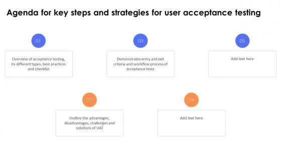 Find a pre-designed and impeccable Agenda For Key Steps And Strategies For User Acceptance Testing. The templates can ace your presentation without additional effort. You can download these easy-to-edit presentation templates to make your presentation stand out from others. So, what are you waiting for Download the template from Slidegeeks today and give a unique touch to your presentation. Our Agenda For Key Steps And Strategies For User Acceptance Testing are topically designed to provide an attractive backdrop to any subject. Use them to look like a presentation pro.