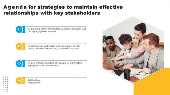 Find a pre-designed and impeccable Agenda For Strategies To Maintain Effective Relationships With Key Stakeholders Background Pdf. The templates can ace your presentation without additional effort. You can download these easy-to-edit presentation templates to make your presentation stand out from others. So, what are you waiting for Download the template from Slidegeeks today and give a unique touch to your presentation. Our Agenda For Strategies To Maintain Effective Relationships With Key Stakeholders Background Pdf are topically designed to provide an attractive backdrop to any subject. Use them to look like a presentation pro.