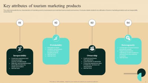 This slide represents the key characteristics of marketing used by businesses to promote their travel products and services. It includes details related to key attributes of tourism marketing products such as inseparability, ownership etc. Boost your pitch with our creative Guide To Winning Tourism Key Attributes Of Tourism Marketing Products Pictures Pdf Deliver an awe-inspiring pitch that will mesmerize everyone. Using these presentation templates you will surely catch everyones attention. You can browse the ppts collection on our website. We have researchers who are experts at creating the right content for the templates. So you do not have to invest time in any additional work. Just grab the template now and use them. This slide represents the key characteristics of marketing used by businesses to promote their travel products and services. It includes details related to key attributes of tourism marketing products such as inseparability, ownership etc.