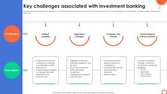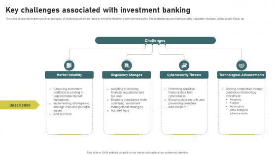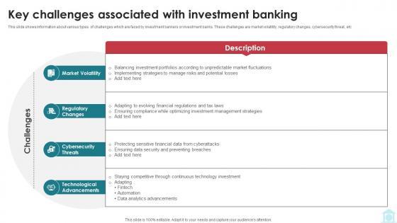 This slide shows information about various types of challenges which are faced by investment bankers or investment banks. These challenges are market volatility, regulatory changes, cybersecurity threat, etc Are you searching for a Key Challenges Associated With Investment Banking Mastering Investment Banking Fin SS V that is uncluttered, straightforward, and original Its easy to edit, and you can change the colors to suit your personal or business branding. For a presentation that expresses how much effort you have put in, this template is ideal With all of its features, including tables, diagrams, statistics, and lists, its perfect for a business plan presentation. Make your ideas more appealing with these professional slides. Download Key Challenges Associated With Investment Banking Mastering Investment Banking Fin SS V from Slidegeeks today. This slide shows information about various types of challenges which are faced by investment bankers or investment banks. These challenges are market volatility, regulatory changes, cybersecurity threat, etc