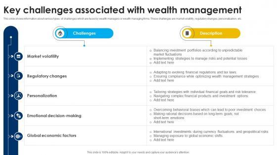 This slide shows information about various types of challenges which are faced by wealth managers or wealth managing firms. These challenges are market volatility, regulatory changes, personalization, etc. Coming up with a presentation necessitates that the majority of the effort goes into the content and the message you intend to convey. The visuals of a PowerPoint presentation can only be effective if it supplements and supports the story that is being told. Keeping this in mind our experts created Key Challenges Associated With Strategic Wealth Management And Financial Fin SS V to reduce the time that goes into designing the presentation. This way, you can concentrate on the message while our designers take care of providing you with the right template for the situation. This slide shows information about various types of challenges which are faced by wealth managers or wealth managing firms. These challenges are market volatility, regulatory changes, personalization, etc.