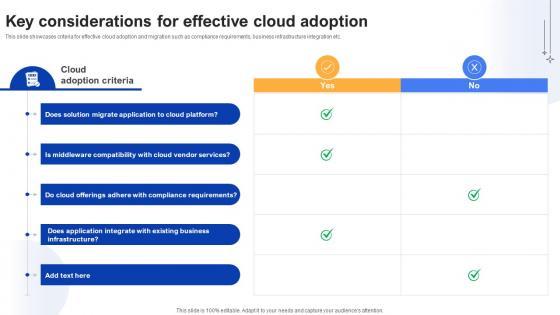 This slide showcases criteria for effective cloud adoption and migration such as compliance requirements, business infrastructure integration etc. Retrieve professionally designed Effective Data Migration Key Considerations For Effective Cloud Adoption to effectively convey your message and captivate your listeners. Save time by selecting pre-made slideshows that are appropriate for various topics, from business to educational purposes. These themes come in many different styles, from creative to corporate, and all of them are easily adjustable and can be edited quickly. Access them as PowerPoint templates or as Google Slides themes. You do not have to go on a hunt for the perfect presentation because Slidegeeks got you covered from everywhere. This slide showcases criteria for effective cloud adoption and migration such as compliance requirements, business infrastructure integration etc.