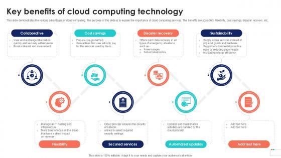 This slide demonstrates the various advantages of cloud computing. The purpose of this slide is to explain the importance of cloud computing services. The benefits are scalability, flexibility, cost savings, disaster recovery, etc. Here you can discover an assortment of the finest PowerPoint and Google Slides templates. With these templates, you can create presentations for a variety of purposes while simultaneously providing your audience with an eye-catching visual experience. Download Key Benefits Of Cloud Computing Data Security In Cloud Computing Ppt Example to deliver an impeccable presentation. These templates will make your job of preparing presentations much quicker, yet still, maintain a high level of quality. Slidegeeks has experienced researchers who prepare these templates and write high-quality content for you. Later on, you can personalize the content by editing the Key Benefits Of Cloud Computing Data Security In Cloud Computing Ppt Example. This slide demonstrates the various advantages of cloud computing. The purpose of this slide is to explain the importance of cloud computing services. The benefits are scalability, flexibility, cost savings, disaster recovery, etc.