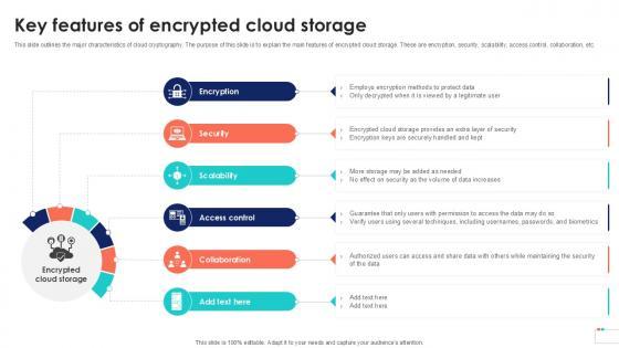This slide outlines the major characteristics of cloud cryptography. The purpose of this slide is to explain the main features of encrypted cloud storage. These are encryption, security, scalability, access control, collaboration, etc. This Key Features Of Encrypted Cloud Data Security In Cloud Computing Ppt Example from Slidegeeks makes it easy to present information on your topic with precision. It provides customization options, so you can make changes to the colors, design, graphics, or any other component to create a unique layout. It is also available for immediate download, so you can begin using it right away. Slidegeeks has done good research to ensure that you have everything you need to make your presentation stand out. Make a name out there for a brilliant performance. This slide outlines the major characteristics of cloud cryptography. The purpose of this slide is to explain the main features of encrypted cloud storage. These are encryption, security, scalability, access control, collaboration, etc.