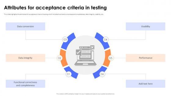 This slide highlights the attributes for acceptance criteria in testing which includes functional correctness and completeness, data integrity, usability, etc. Do you have to make sure that everyone on your team knows about any specific topic I yes, then you should give Key Steps And Strategies Attributes For Acceptance Criteria In Testing a try. Our experts have put a lot of knowledge and effort into creating this impeccable Key Steps And Strategies Attributes For Acceptance Criteria In Testing. You can use this template for your upcoming presentations, as the slides are perfect to represent even the tiniest detail. You can download these templates from the Slidegeeks website and these are easy to edit. So grab these today This slide highlights the attributes for acceptance criteria in testing which includes functional correctness and completeness, data integrity, usability, etc.