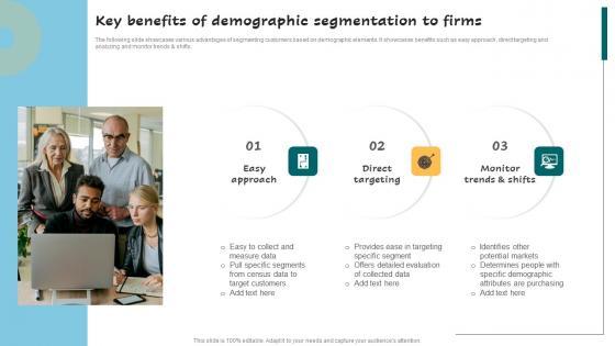 The following slide showcases various advantages of segmenting customers based on demographic elements. It showcases benefits such as easy approach, direct targeting and analyzing and monitor trends and shifts. Create an editable Key Benefits Of Demographic Segmentation To Firms Ppt Portfolio Guide PDF that communicates your idea and engages your audience. Whether you are presenting a business or an educational presentation, pre designed presentation templates help save time. Key Benefits Of Demographic Segmentation To Firms Ppt Portfolio Guide PDF is highly customizable and very easy to edit, covering many different styles from creative to business presentations. Slidegeeks has creative team members who have crafted amazing templates. So, go and get them without any delay.