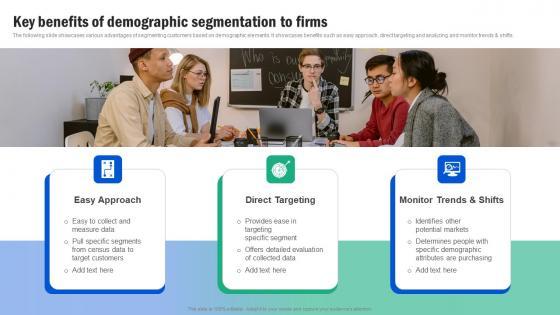 The following slide showcases various advantages of segmenting customers based on demographic elements. It showcases benefits such as easy approach, direct targeting and analyzing and monitor trends and shifts. Slidegeeks has constructed Key Benefits Of Demographic Segmentation To Firms Guide For Segmenting And Formulating Slides Pdf after conducting extensive research and examination. These presentation templates are constantly being generated and modified based on user preferences and critiques from editors. Here, you will find the most attractive templates for a range of purposes while taking into account ratings and remarks from users regarding the content. This is an excellent jumping off point to explore our content and will give new users an insight into our top notch PowerPoint Templates. The following slide showcases various advantages of segmenting customers based on demographic elements. It showcases benefits such as easy approach, direct targeting and analyzing and monitor trends and shifts.