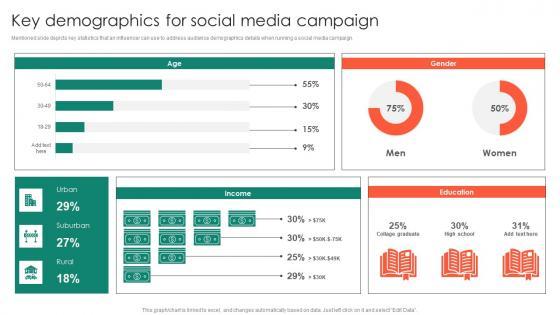 Mentioned slide depicts key statistics that an influencer can use to address audience demographics details when running a social media campaign. Whether you have daily or monthly meetings, a brilliant presentation is necessary. Comprehensive Personal Branding Guidelines Key Demographics For Social Media Campaign Rules PDF can be your best option for delivering a presentation. Represent everything in detail using Comprehensive Personal Branding Guidelines Key Demographics For Social Media Campaign Rules PDF and make yourself stand out in meetings. The template is versatile and follows a structure that will cater to your requirements. All the templates prepared by Slidegeeks are easy to download and edit. Our research experts have taken care of the corporate themes as well. So, give it a try and see the results.