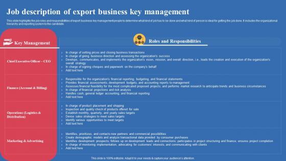 This slide highlights the job roles and responsibilities of export business key management people to determine what kind of job has to be done and what kind of person is ideal for getting the job done. It includes the organizational hierarchy and reporting system to the candidate. This modern and well-arranged Job Description Of Export Business Key Management Export Business Plan Information Pdf provides lots of creative possibilities. It is very simple to customize and edit with the Powerpoint Software. Just drag and drop your pictures into the shapes. All facets of this template can be edited with Powerpoint no extra software is necessary. Add your own material, put your images in the places assigned for them, adjust the colors, and then you can show your slides to the world, with an animated slide included. This slide highlights the job roles and responsibilities of export business key management people to determine what kind of job has to be done and what kind of person is ideal for getting the job done. It includes the organizational hierarchy and reporting system to the candidate.